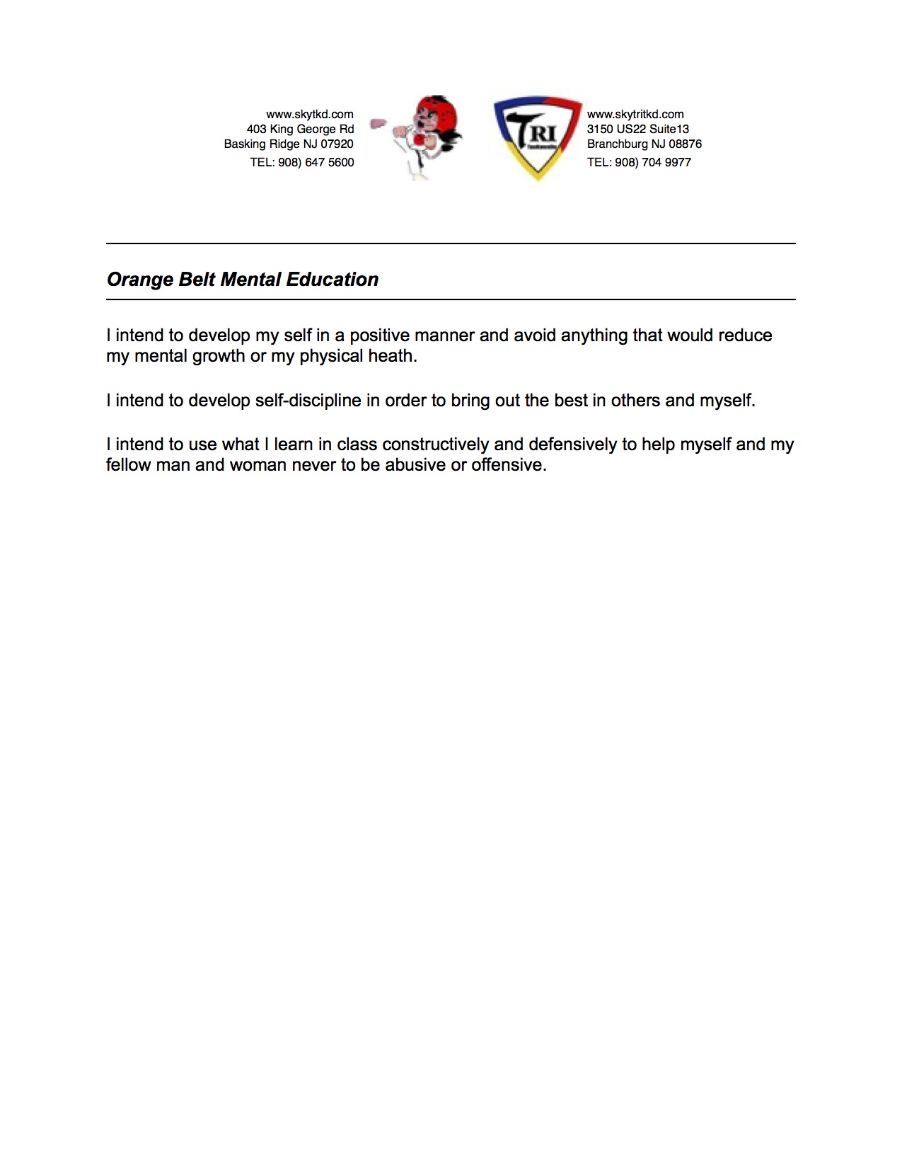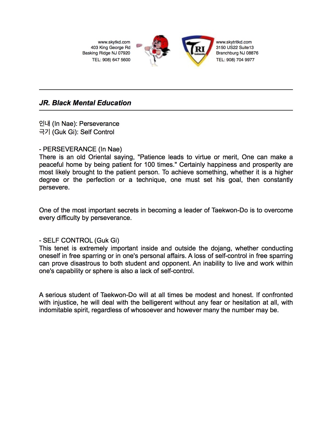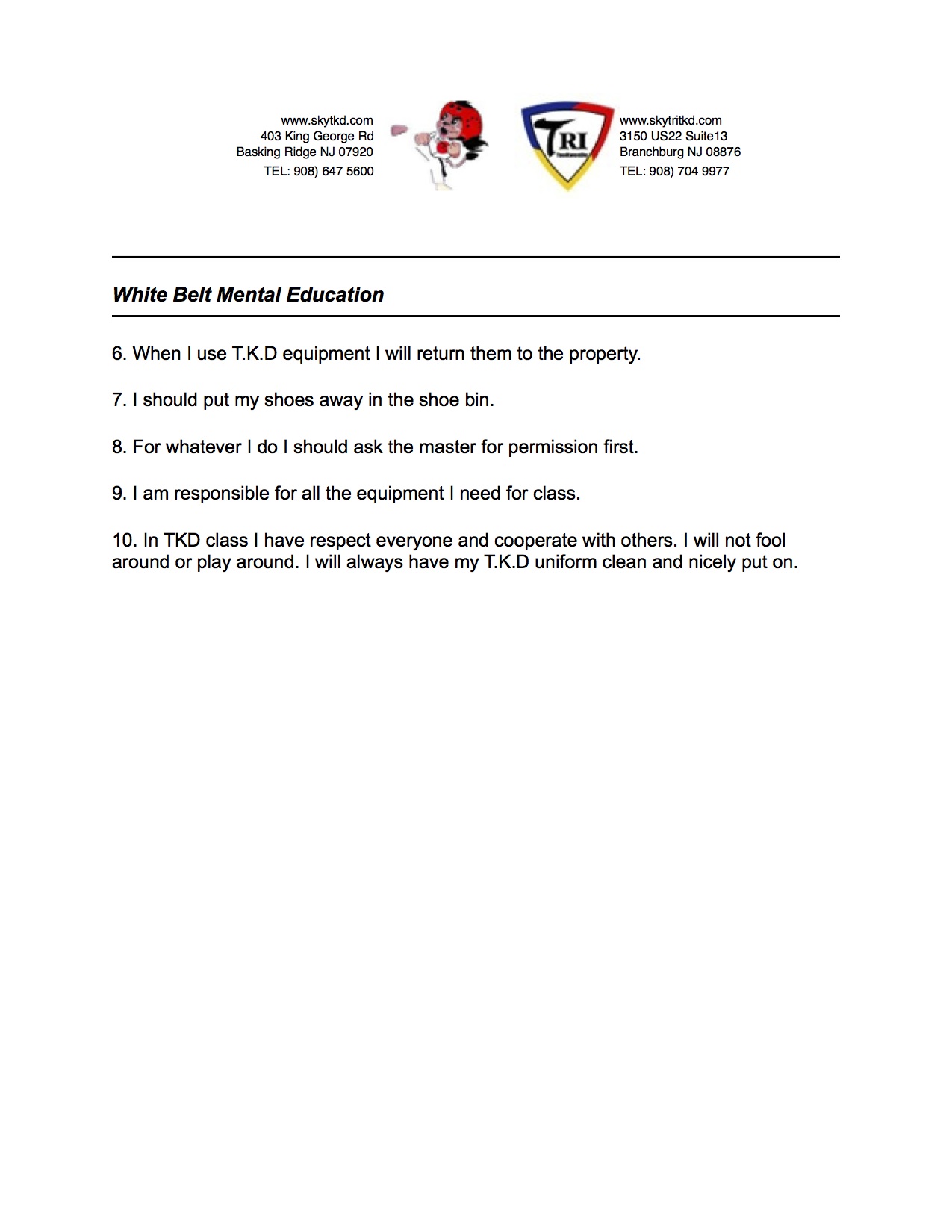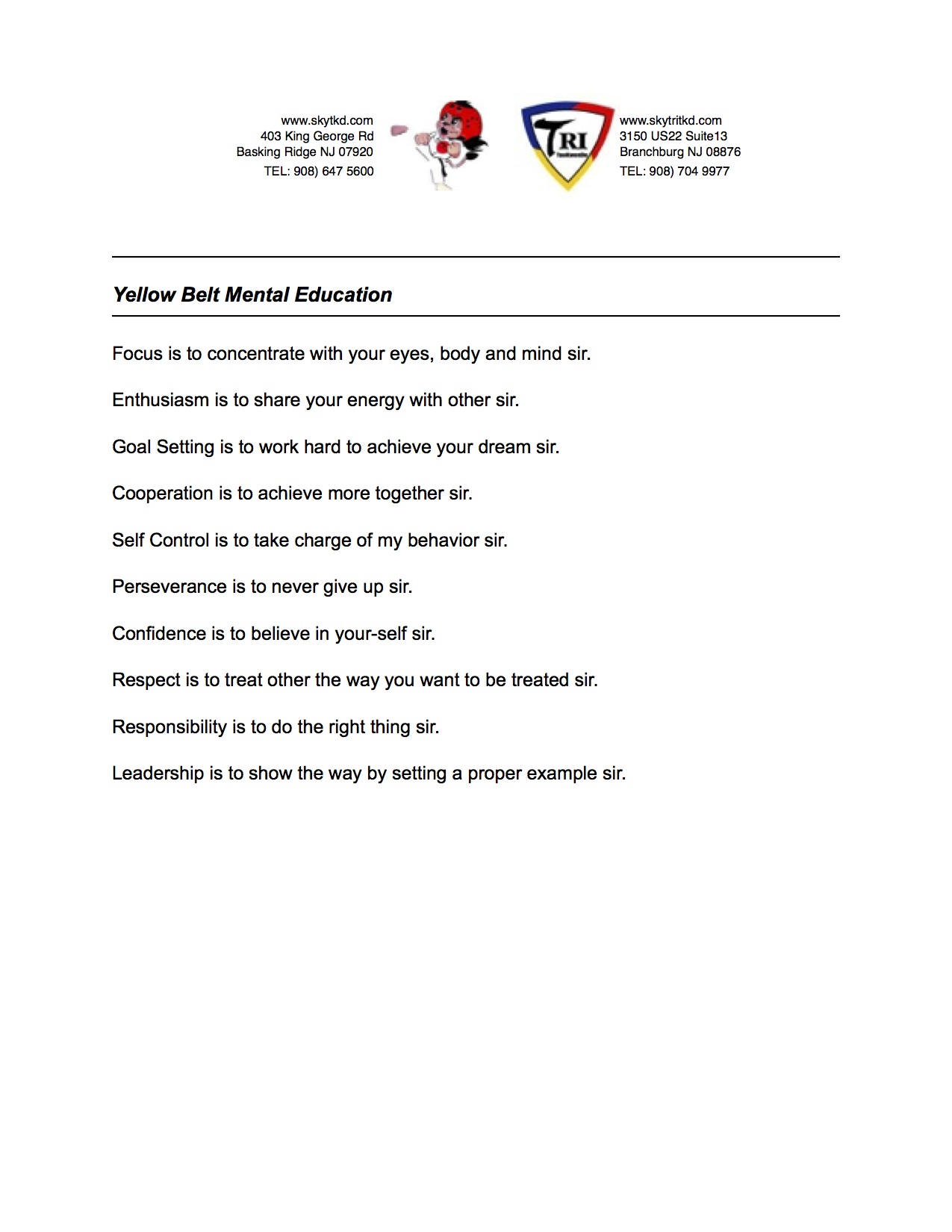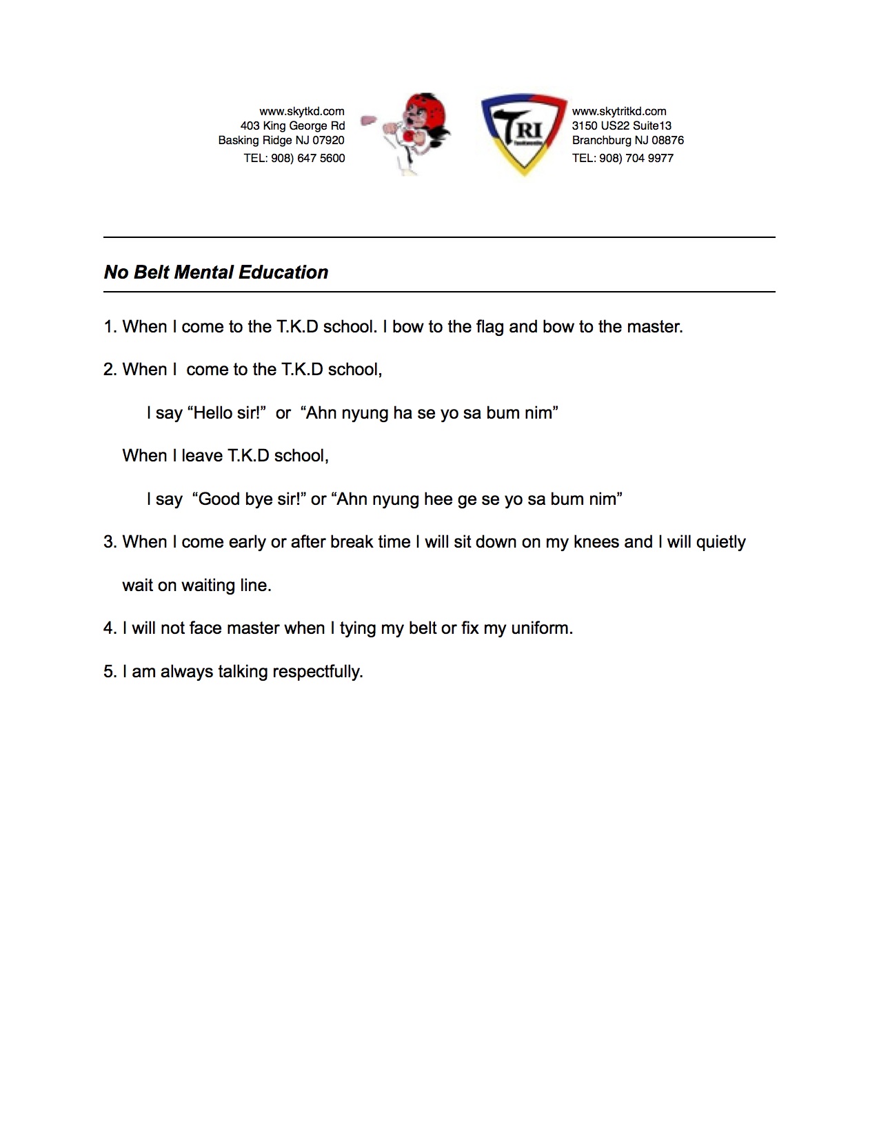 Mental Education : You need to memorize Mental Education of current color belt for getting next color belt on The Belt Tesing Day. No Belt White Yellow Orange Green Blue Purple Red Brown Jr. Black