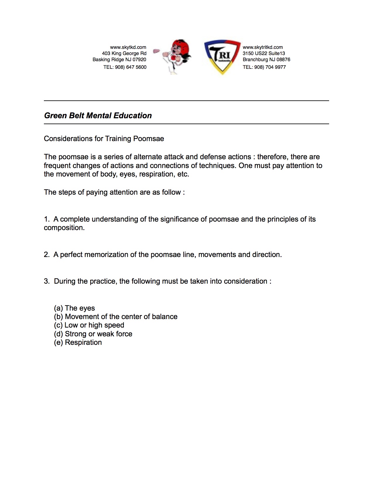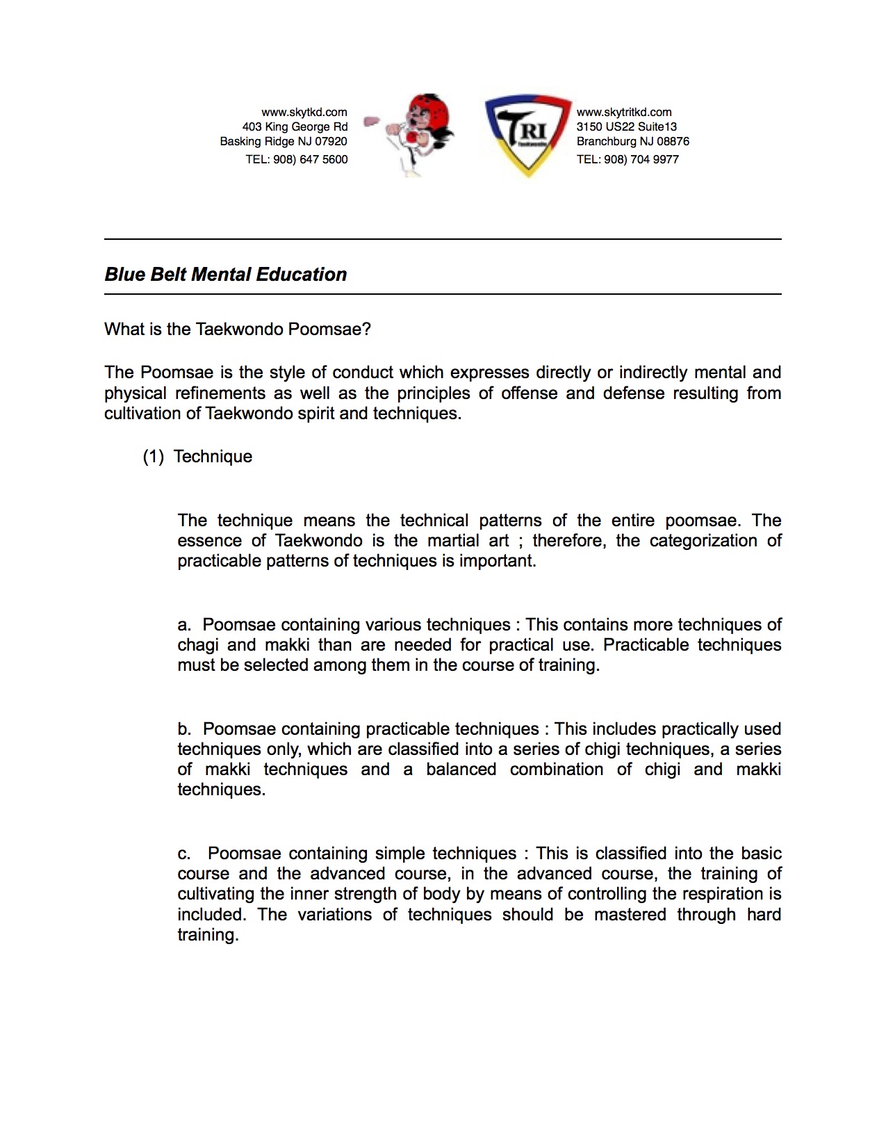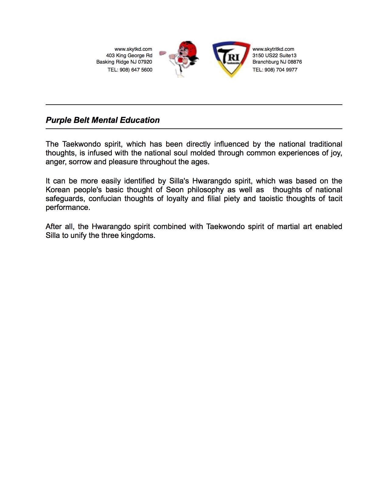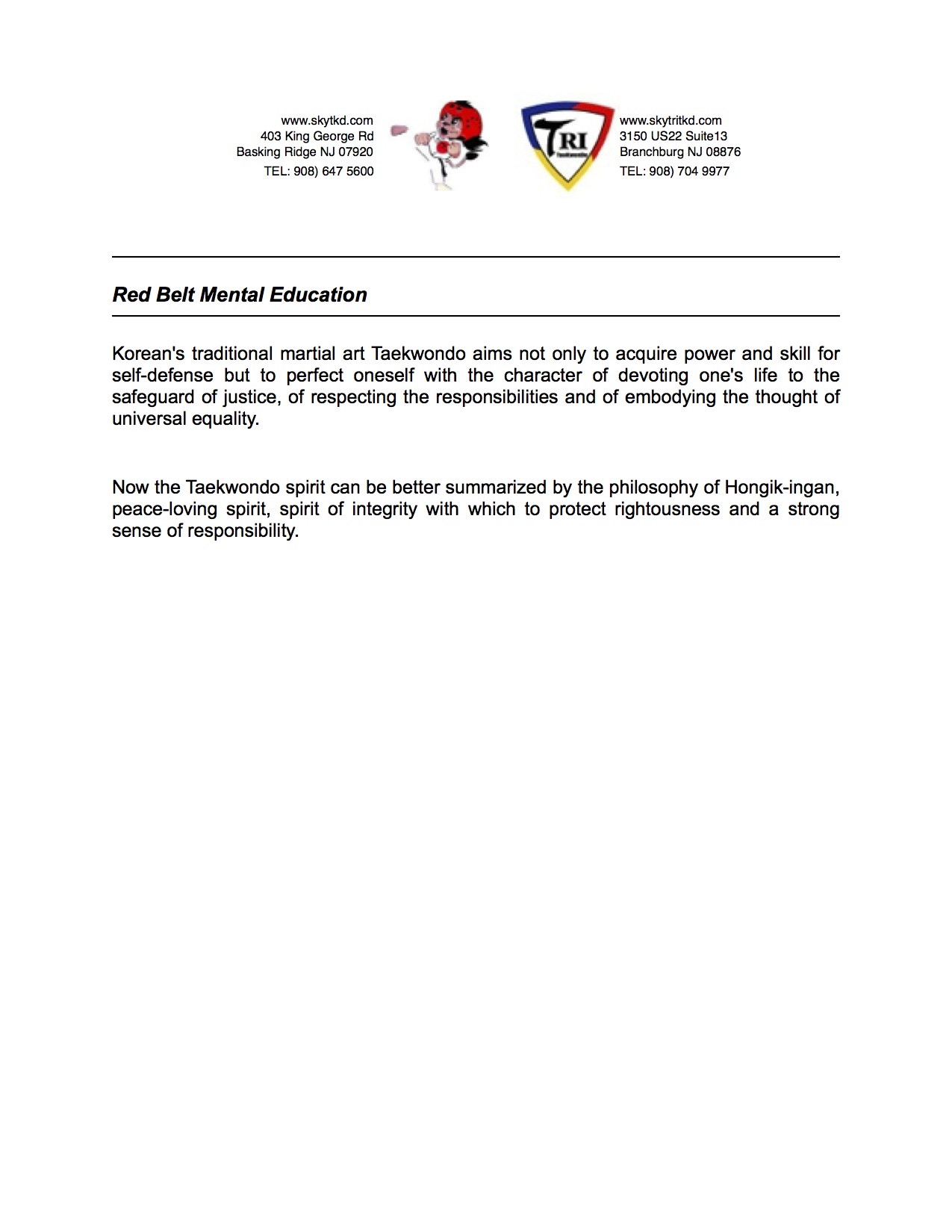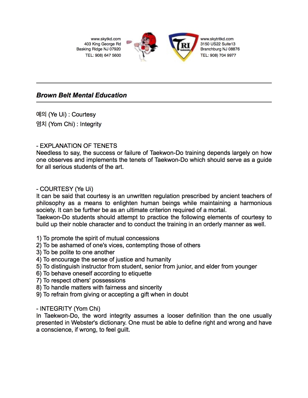 Mental Education : You need to memorize Mental Education of current color belt for getting next color belt on The Belt Tesing Day. No Belt White Yellow Orange Green Blue Purple Red Brown Jr. Black